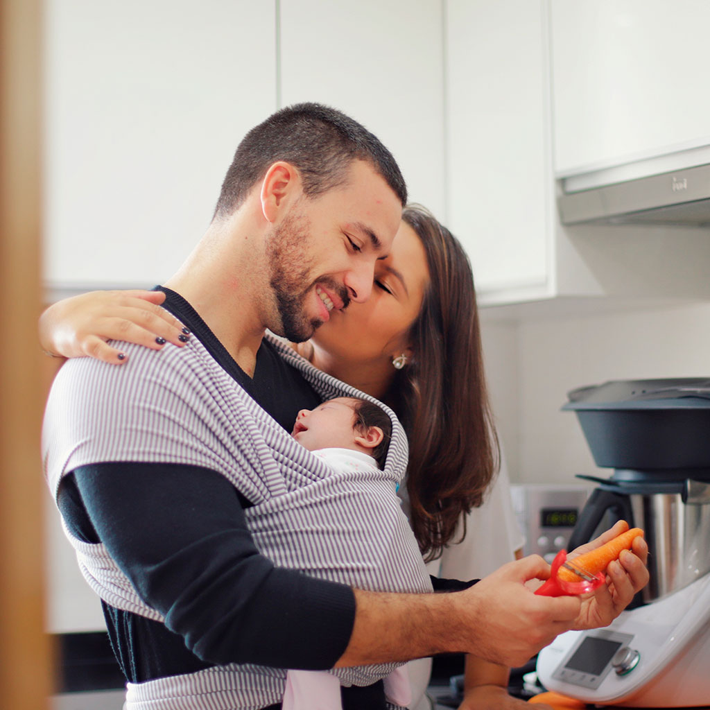 Ao longo dos anos em que tenho feito aconselhamento dos casais, eu oriento de forma a que, ainda na gestação, o companheiro ou companheira, treine o uso do Sling como forma de aprender os nós e os ajustes, usando uma almofada ou até um boneco. Desta forma, após o nascimento, aconselho que o outro cuidador possa acolher esse bebé no Sling e caminhar, sair um pouco, andar com o bebé, até que a mãe tenha também condição de fazer uso do Sling.